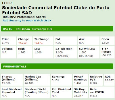 Aproveitando uma visita ao site da Bloomberg, deixo aqui alguns "fundamentals" relativos ao título da FC Porto SAD:
